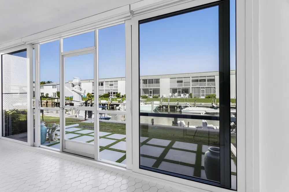 This 2-bedroom, 2-bath first-floor end-unit waterfront condo lives like a private residence, offering rare indoor-outdoor living directly on the water. Enjoy the freedom to plant your own garden or grill waterfront meals, all from your expansive private patio. Light and bright throughout, the residence features a private side entrance and a recently remodeled kitchen with granite countertops and stainless steel appliances. The home truly feels like its own retreat with an extended waterfront patio enhanced by oversized pavers and artificial turf, creating a refined, elegant outdoor space perfect for relaxing or entertaining. Laminate wood flooring flows throughout the home, complemented by crown molding, plantation shutters, and full hurricane-impact windows and doors. The roof was completely replaced in 2025 with no remaining assessments! The spacious primary suite offers custom built-in wall shelving and a large walk-in closet. Both bathrooms have been mildly updated. The former patio has been transformed into a fully enclosed sunroom with impact glass and remote-controlled privacy shades, providing additional year-round living space with tranquil water views. Convenience is unmatched with direct front parking just steps from your door. The pet-friendly community allows pets with some restrictions. Dockage is available at an exceptionally low rate of just $2 per square foot, and the Palm Beach Inlet is only a 7-minute boat ride away. Whether you're a boating enthusiast or seeking the perfect seasonal escape, this waterfront gem delivers the ultimate lifestyle. Relax, unwind, and enjoy the feeling of a permanent vacation in your own sparkling waterfront retreat.