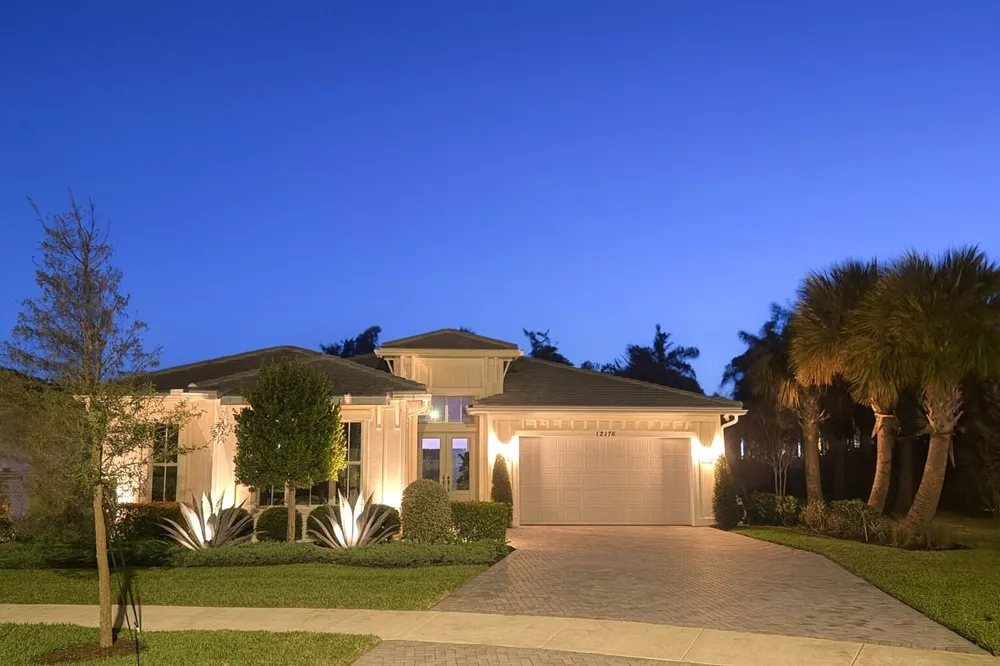 This beautifully appointed open-concept home sits on a premier privacy corner lot with a generous yard and striking Coastal exterior. A spacious foyer welcomes you with tray ceilings, custom trim, and crown molding throughout the main living areas. The chef's kitchen shines with an oversized 2'' quartz island, coffee bar, open shelving, ample storage, and upgraded Monogram appliances. Step outside to your private backyard oasis--fully fenced with low-maintenance artificial turf, curated landscaping, hardscape rock accents, landscape lighting, and an expansive patio built for entertaining. The Primary Suite overlooks the manicured backyard and features a spa-like bath with a Restoration Hardware vanity, freestanding tub, oversized curbless shower, and large walk-in closet. Two guest bedrooms, a dedicated office, 3-car garage, and a whole-home Generac generator complete the package--plus the resort-style pool and clubhouse are directly across the street. Other amenities include, Business center, café/restaurant, fitness center, pickle ball, golf course, tennis, and more. Close walkways to pool, and Publix. The town center is opening up soon. It's going to be amazing. A new Publix, Walgreens, tons of shops, restaurants and all within walking distance. Golf cart paths are everywhere...don't even need your car. Weather vane in back yard, credenza and light fixtures in living room, refrigerator in Garage do not convey