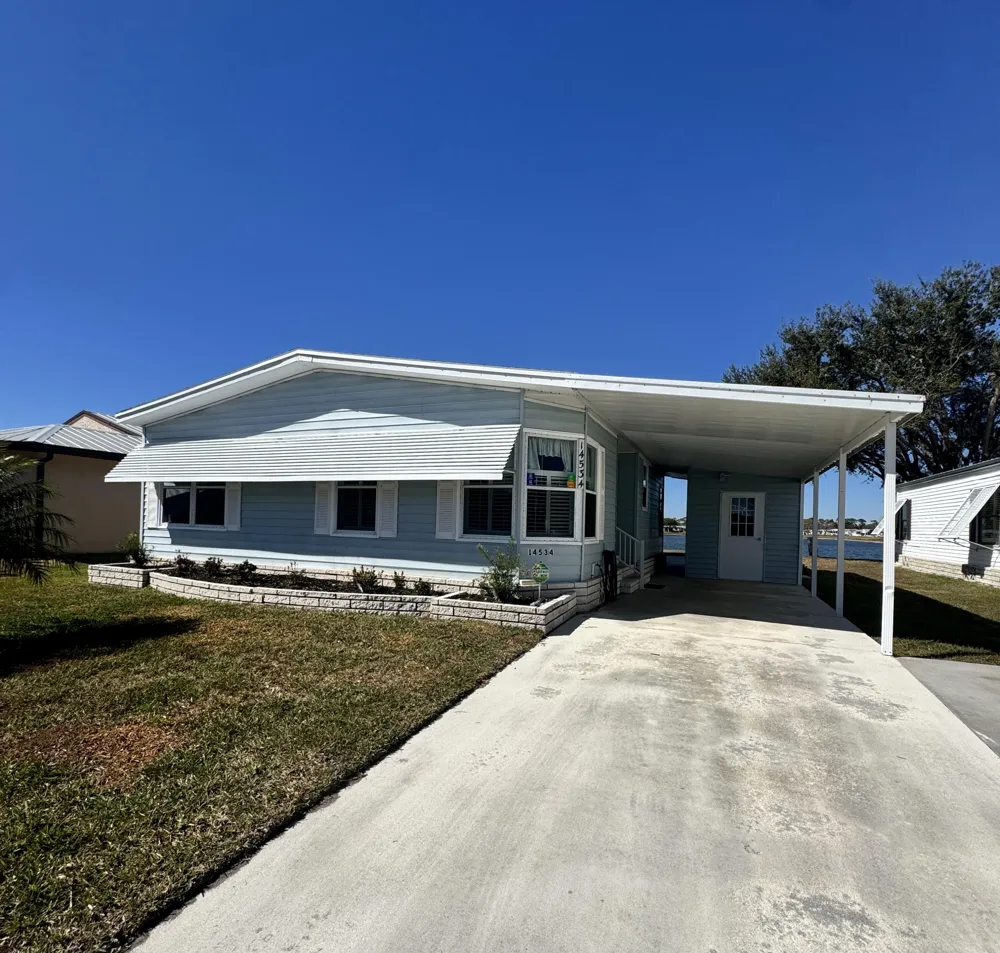 Lovely 2-bedroom 2-bath home with lake view in the desirable 55+Spanish Lakes Fairways community. The home sits on a very quiet street, with peaceful lake views from the oversized 23.5 x 19.5 back living area. Perfect for morning coffee or evening cocktails. Directly off the back of the home is a patio area for soaking up the Florida sun. Roof is 2024 A/C, 2019, and a new water heater in 2025. The home has been very well maintained. Home is being sold partially furnished. Spanish Lakes has 2 pools, a private 18-hole golf course, sauna, fitness room, library, billiards, craft room, bocce, pickleball, shuffleboard, darts, and more. Lawn cutting and trash removal are also included in the lot rent.