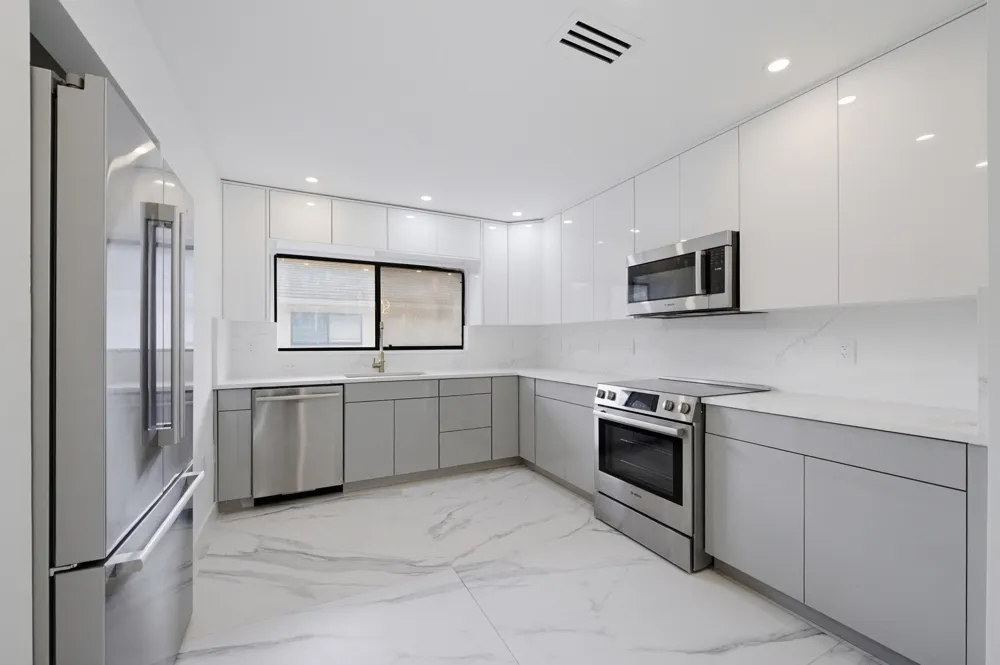 Beautiful 2-bedroom unit on the 2nd floor, conveniently located near the elevator. Fully permitted, high-end renovation featuring an open-concept European kitchen with Bosch appliances. Located in the desirable Trowbridge A building with lake views. Large porcelain tile throughout, cathedral ceilings, and recessed lighting enhance the spacious feel. Den/office offers flexibility and can be used as a third bedroom. Stacked washer and dryer provide additional space efficiency. Situated in the sought-after 55+ Lakes of Delray community offering resort-style amenities including indoor and outdoor pools, tennis, golf, clubhouse, and more. Close to shopping and dining.