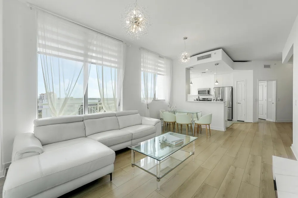 Gorgeous, fully remodeled Miami loft-style residence, offered fully furnished, featuring 2 bedrooms and 2 Bathrooms plus an open den on the 12th floor with expansive views of the pool, city skyline, and lake. This bright and modern condo showcases 10-foot ceilings and floor-to-ceiling impact glass that opens to a spacious wraparound terrace, creating seamless indoor-outdoor living. The updated kitchen is designed for both style and function, complete with NEW stainless steel appliances, granite countertops, and light oak cabinetry. Located at The Edge, a pet-friendly building in Downtown West Palm Beach, residents enjoy a 24-hour attended lobby and resort-style amenities, including a rooftop Olympic-size pool, clubhouse, state-of-the-art fitness center, zen room, and spa.