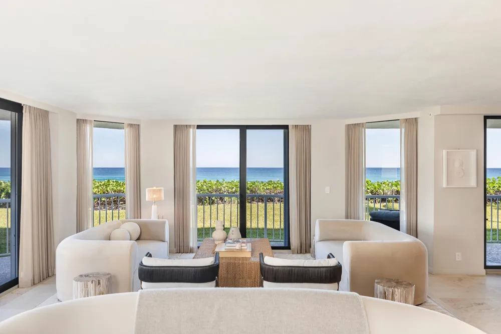 Located directly on the ocean in the prestigious Enclave building on South Ocean Boulevard in Palm Beach, this beautifully designed residence was created by renowned interior designer Noa Santos. The three bedroom, three bath condominium offers 3,577 total square feet of sophisticated living space with exceptional craftsmanship and high-end finishes throughout. The expansive open living and dining areas are designed for both comfort and elegance, with floor-to-ceiling glass doors that fill the space with natural light and frame the breathtaking ocean views. A wraparound balcony allows for a seamless indoor-outdoor flow with views of the lush green space extending to the Atlantic Ocean creating a serene setting for relaxing and entertaining. The gourmet kitchen is equipped with top-of-the-line Miele appliances, including an oven, microwave combo oven, and stovetop, complemented by a Liebherr refrigerator and freezer. A custom coffee bar and a sophisticated wet bar with an ice maker, fridge, and fluted paneling enhance the home's refined entertaining spaces. A grand entryway and a spacious front hall closet add to the home's thoughtful design. The primary suite is a private retreat featuring two walk-in closets, a built-in desk, a linen closet, and a dedicated shoe closet. Wood floors add warmth and elegance, while terrace doors open to stunning ocean vistas. The spa-inspired primary bath includes dual sinks, a walk-in shower, a separate soaking tub, and a private water closet with a toilet and bidet. The guest suite offers a walk-in closet, an en suite bath with a walk-in shower, and private balcony access with ocean views. The third bedroom opens out onto the terrace with stunning views of the water. An additional bath features a custom vanity and a reeded glass shower enclosure. Additional conveniences include a spacious laundry room with a sink, hanging space, and ample storage, as well as a large front hall closet. Full hurricane doors ensure security and peace of mind, while a Trane A/C system and a water purification system add to the home's modern comforts. The Enclave offers resort-style amenities, including a pool, hot tub, grilling area, tennis court, a state-of-the-art fitness center, and a beautifully appointed party room with a bar and card area. The building also offers a 24-hour doorman and security, a full-time on-site manager, and a gated entrance. Additional features include two garage parking spaces, bike storage, and a private air-conditioned storage unit.