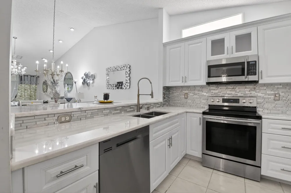 Extraordinary renovated rental! PHENOMENAL Location Stunning, move-in-ready 2-bedroom + den, 2-bath condo. with beautifully renovated kitchen. Enjoy morning coffee in your serene and pristine Florida room in this private, and secure, 55+ gated community. Open floor plan features vaulted ceilings for a house-like feel, Florida room, updated kitchen and a private garage. Ready for immediate occupancy. Newer washer & dryer.Palm Chase Lakes is an active 55+ community w/ resort style amenities featuring magnificent pool and spa, tennis, pickleball, shuffleboard, social hall+. Very close to worship!